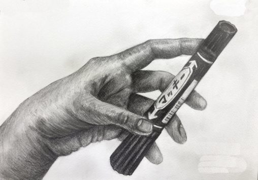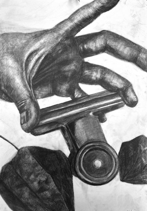 受験生デッサンです。 手の練習でいろんなモチーフと一緒に…