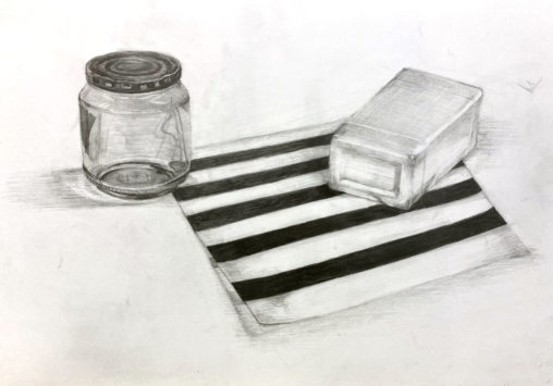 初めの方の基本のデッサンです。 瓶とモノクロストライプの…