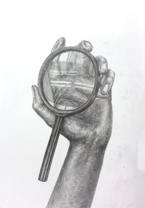 受験生デッサンで、手と虫眼鏡です。 構成やガラスのツヤっ…